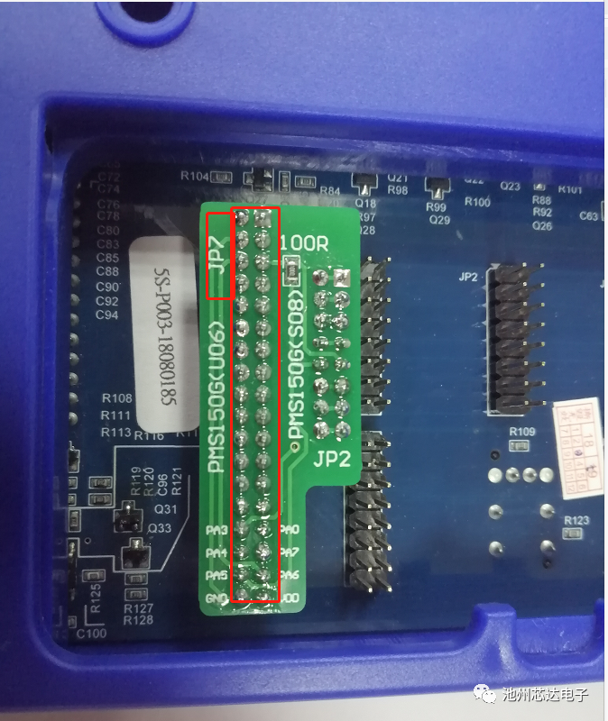 以PMS150G-S08為例,為提升IC批量燒錄的穩(wěn)定性及可靠性,燒錄前,請?jiān)赪riter背后JP2的PA5引腳上串一個100?的電阻。連接方式參考如下圖:
